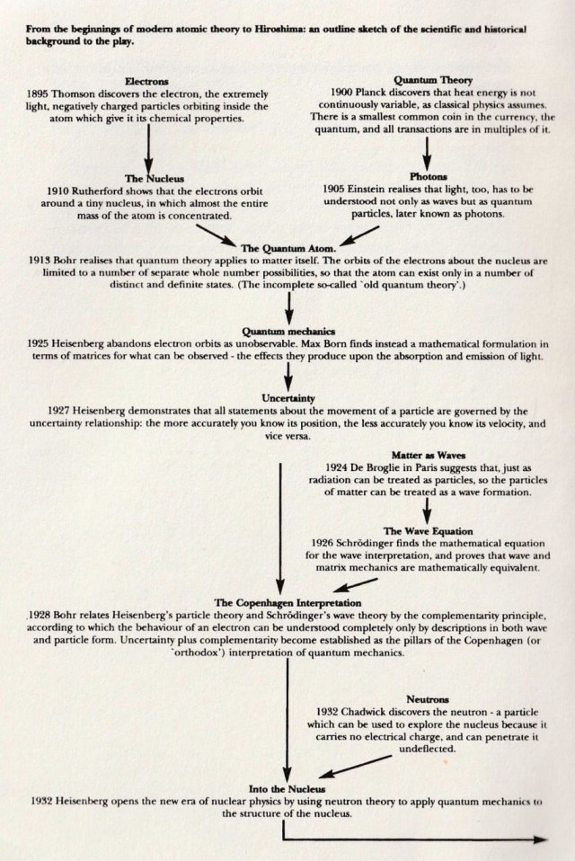 Eva and I were in San Francisco during January, 2002. We attended a performance of the play Copenhagen at the Curran Theater, the undated playbill of which I recently came across, and was reminded of my resolve to get the script of the play for later reading. I have now done so. I am glad I did because I had forgotten the important points it presented. These points are in the realms of war, science, philosophy, patriotism, politics and morality. Will this be enough for you to chew on?
