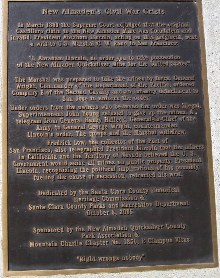 Plaque at the southern entrance to Almaden Quicksilver County Park, commemorating the Executive Order of President Lincoln putting the mines under federal control, which was shortly thereafter rescinded (please click on the image to read more clearly)