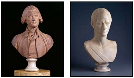 Busts of Jefferson and Hamilton, which Jefferson placed on opposite sides of the entrance hall at Monticello. This arrangement, he told visitors, showed them “opposed in death as in life”. (mahg/ashland/edu)