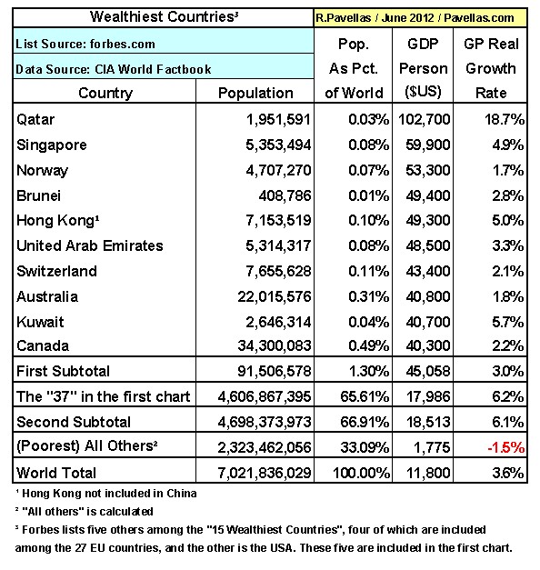 These thirty-seven states comprise 65% of the world’s population, leaving 35% populating the remaining 205 states and territories. These 205 entities, except for an additional ten rich states which are included in the 205 (see below), are very poor. Their aggregate GDP per person (even including the few rich countries) is at 82% of the world’s average of US$11,800.