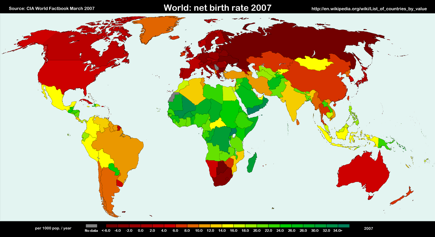 The accepted figure for a country’s fertility rate which will, without regard to net migration, keep a country at a constant population is 2.1 births per woman. The world average is 2.5 births per woman. On the assumption that it is good for a country to have a fertility rate between 2.1 and 2.5 (irrespective of net migration figures), these countries are the outliers: Nigeria, Pakistan, Bangladesh, and India have a fertility rate greater than 2.5; China, Japan, Russia and the EU have a fertility rate lower than 2.1.