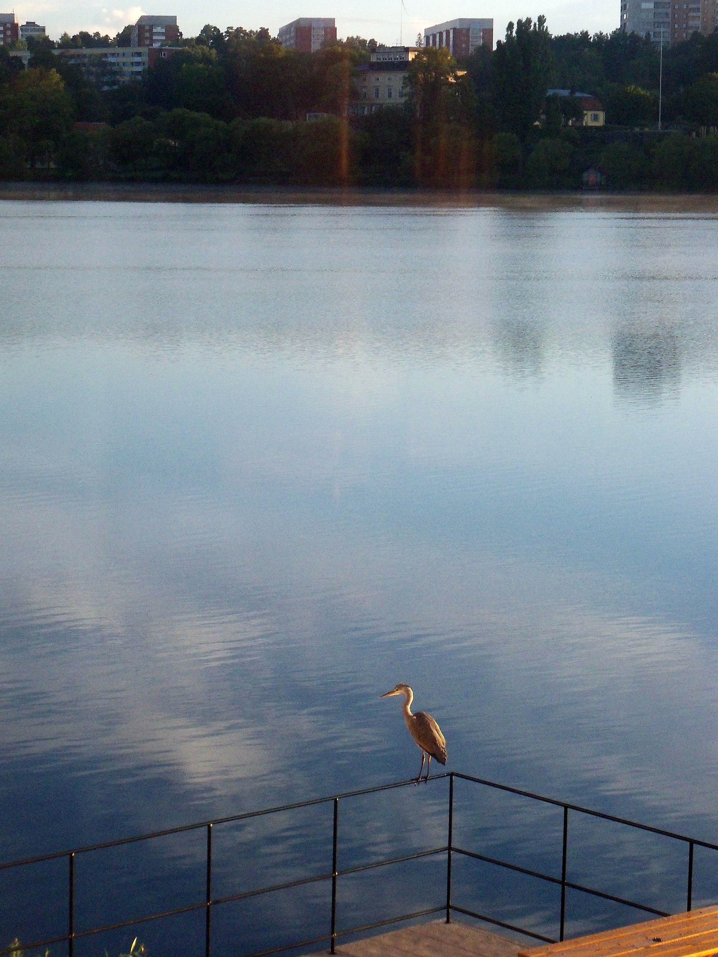 The sun glances off the light-colored buildings across the lake