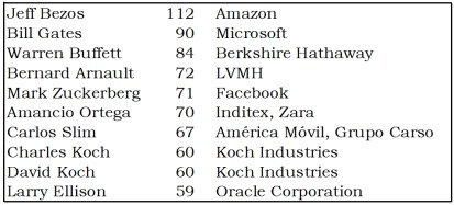 Here is the net worth of the “top ten” (measured in billions of dollars, 2018; source = Forbes Magazine).