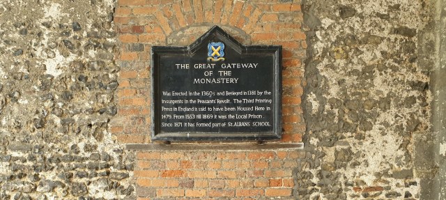 (The city of) St Albans played a major part in the Peasant’s Revolt of 1381. Conflict had been growing with the Abbot over millihg rights and it was at Romeland that the local people gathered before breaking into the Abbey Gatehouse, which at the time housed the Abbott’s prison. The Present Great Gateway was built in the 1380s… (The gate) symbolises the conflict between the monastery and the town which was not resolved until the dissolution of the monasteries in 1539 (under Henry VIII).