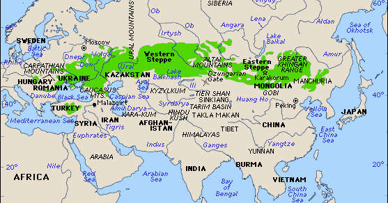 A salient aspect of the larger region within which the Black Sea is located, is a great prairie (above, in green) stretching from China through Southern Europe through which the “Golden Horde” and other eastern pastoral people gained access to the west . These prairies are called “steppes” and are celebrated in stories and music, presaging the “old west” legends of the prairie in North America.