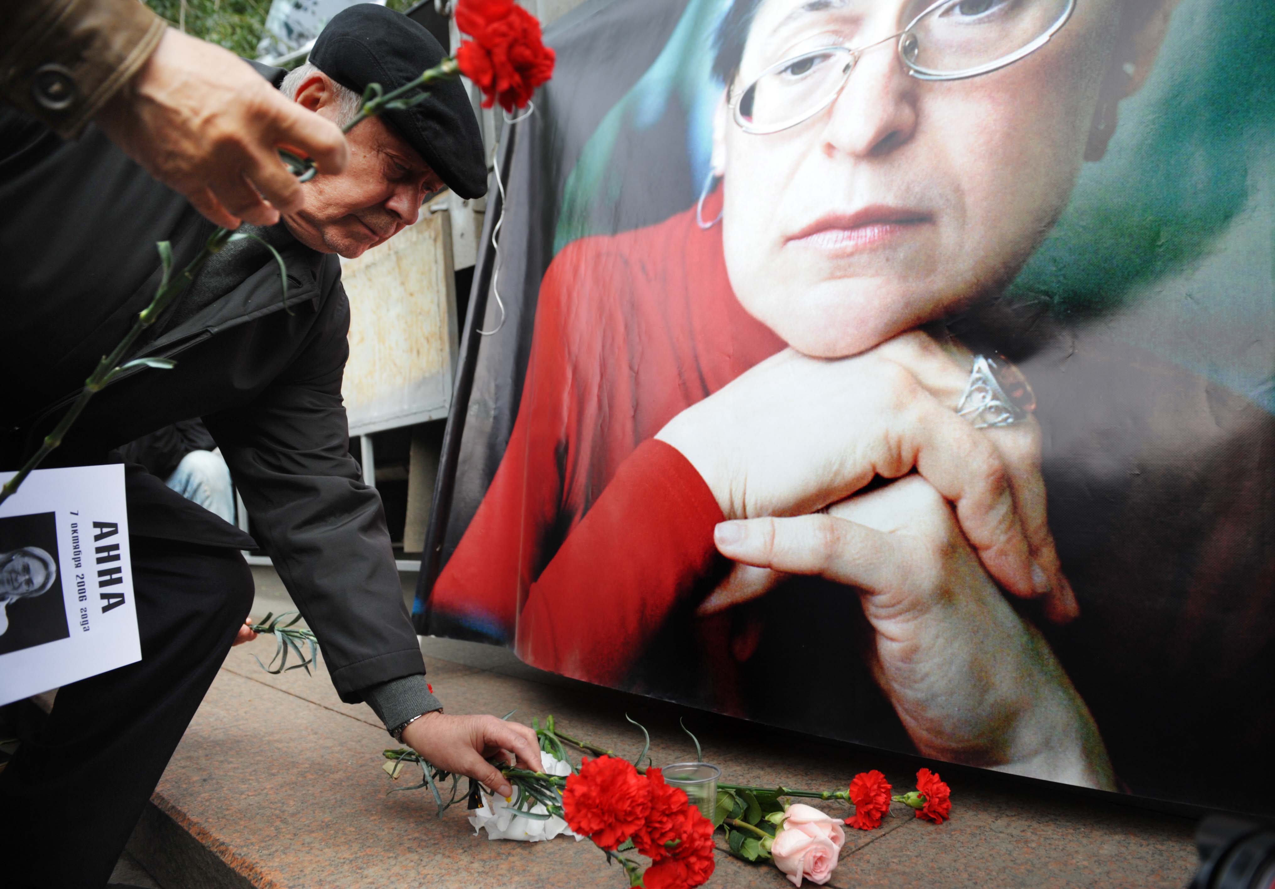 Russian human rights activists place flowers at a portrait of slain Russian journalist Anna Politkovskaya in Moscow on October 7, 2009 during a rally on the third anniversary of her death at the hands of an unknown gunman. (Source: http://www.lecourrierderussie.com/2011/08/25/)