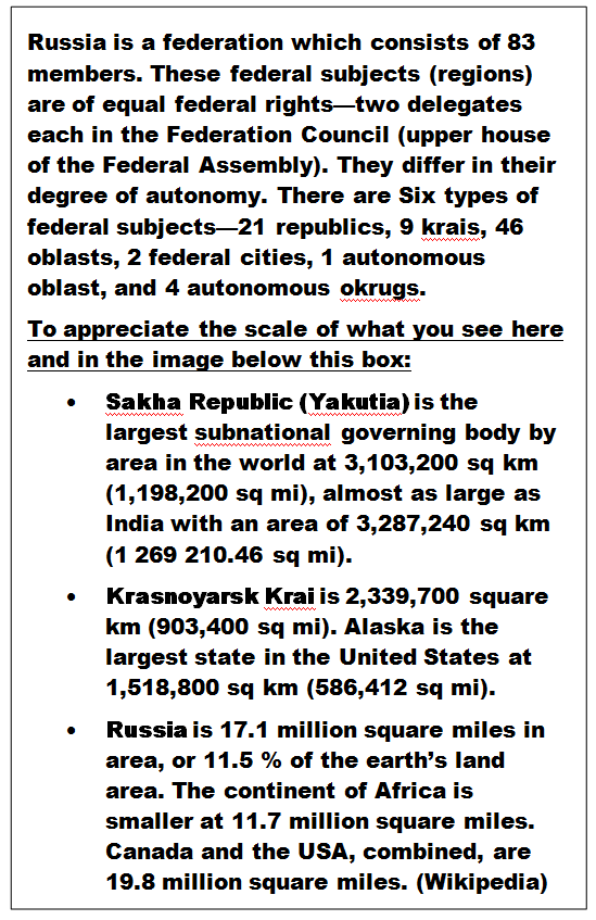 Meanwhile, according to Albats: 2000 former business leaders are in labor camps and jails; 80% of all the top dogs in government are ex-KGB employees; the 83 regions keep only 30% of the taxes they collect and must send 70% to the Kremlin. The President of the Russian Federation is the effective ruler of every subordinate political jurisdiction.