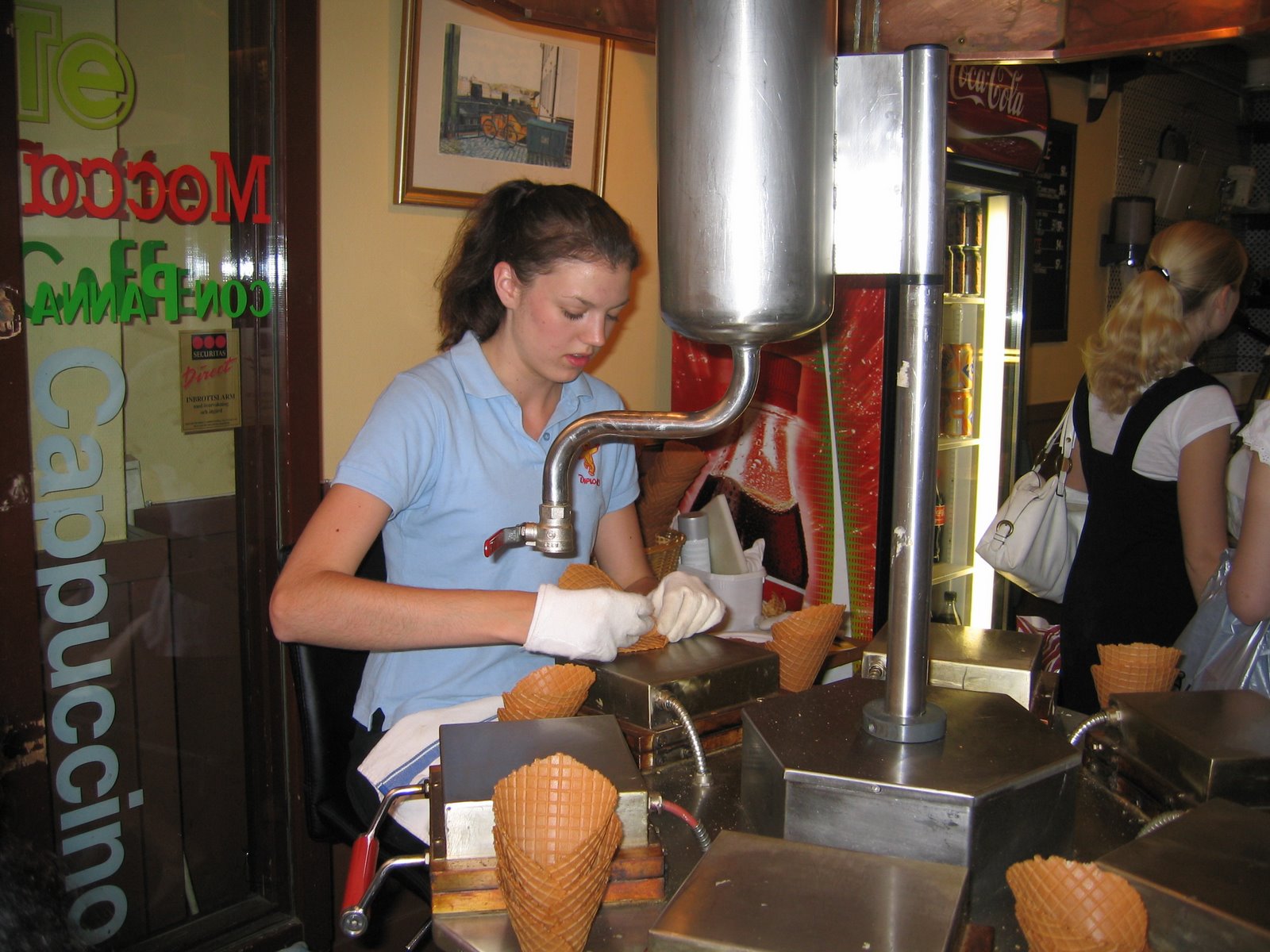 Liv’s summer job, making waffle cones at an ice cream store in Old Town (Gamla Stan)