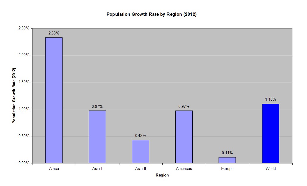 We see here that world population is currently growing at the rate of 1.1 percent per year. One region drives this number: Africa, at 2.33% per year. If all data from Africa were taken out of the calculation (i.e., if the continent theoretically did not exist), the world growth rate would be 0.88%. This calculation puts into even greater perspective that Asia-II and Europe are lagging far behind in population growth rate.