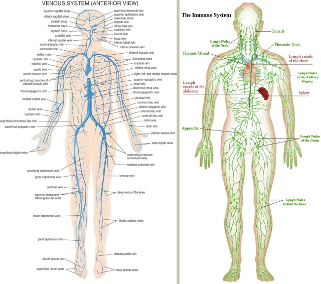 The lymphatic fluid takes all the waste products away from your tissues. As it moves toward its final destination in the blood stream, it passes through the analysis stations of the lymph nodes where bacteria and other harmful micro-organisms are detected. An alarm goes off in the lymph nodes that signals the production of warriors to attack them. The residue will be taken care of by the cleansing processes of the bloodstream: the liver, the kidneys and the spleen. All the output of the lymphatic system is poured into the venous blood system at two large veins under your collar bones, the subclavian veins. As the blood passes through the kidneys some waste products are done away with through bladder and the urine. When the blood passes through the liver other waste (like toxins) is discarded of through the bowel. The spleen mainly takes care of old erythrocytes (red blood cells); it also part of the immune system.